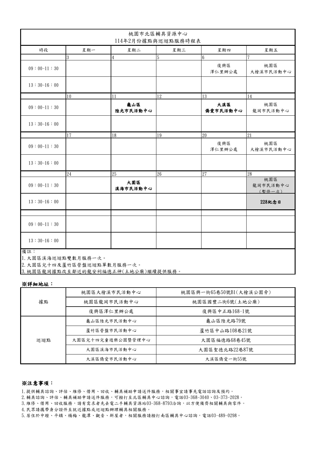 5.居住於中壢、平鎮、楊梅、龍潭、觀音、新屋者,相關服務請撥打南區輔具中心諮詢,電話03-489-0298。