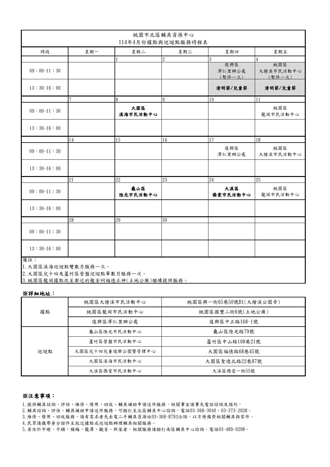 114年4月據點與巡迴點服務時程表