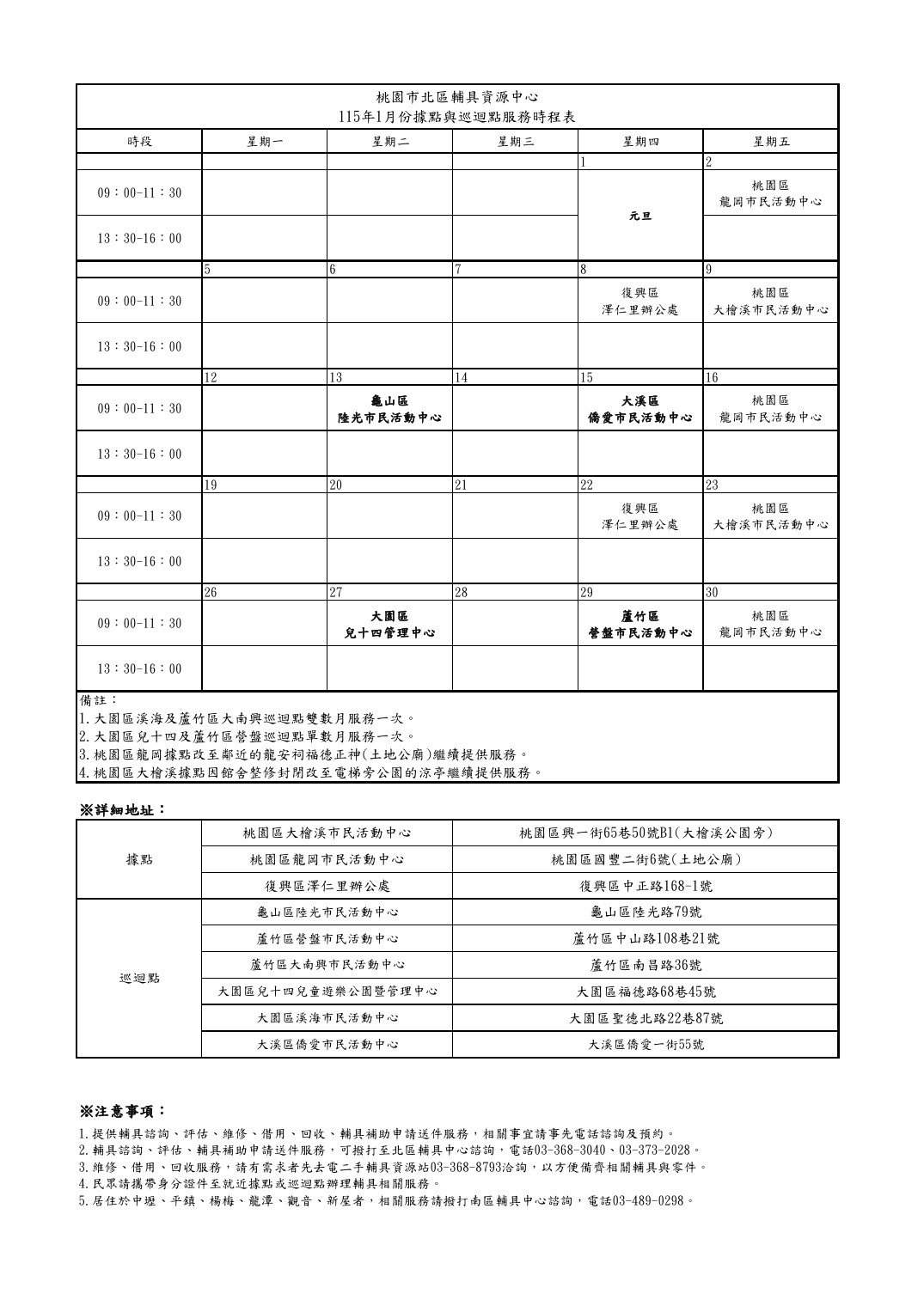 115年1月據點與巡迴點服務時程表